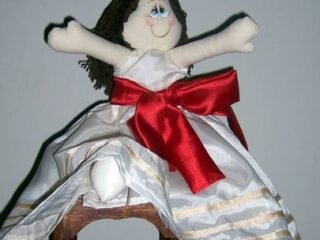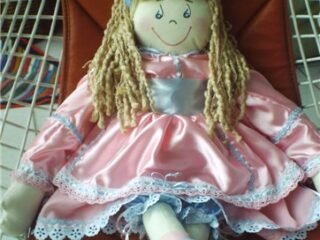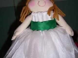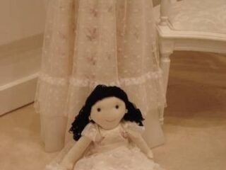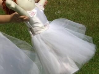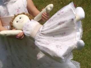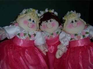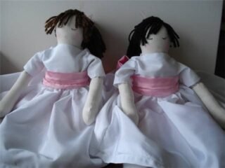 Alguns detalhes como o vestido e o sapato dão charme à boneca daminha. Os sapatos são botinhas de cetim ou feltro e o vestidinho normalmente é feito de tecidos de cetim com bordados de casinha de abelha e armação de tule. “As bonecas são confeccionadas com tecidos de algodão e fibra antialérgica. Todas elas usam calcinha e anágua. Levamos em média uma semana para aprontar a boneca”, afirmou a artesã Karla Wasch, da Bonecas Encantadas.