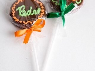 Para combinar com o estilo vintage das delícias, a Caramelada criou uma sacolinha de madeira pintada de acordo com a decoração, contendo pirulito de chocolate personalizado, pão de mel, canudo de brigadeiro com crisp e wafle.