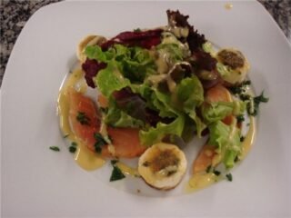 Rabalo grelhado e camarão com roll de acelga e cogumelos e purê de Camboja ou