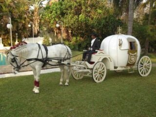 Os casamentos realizados ao ar livre, no campo, na praia ou no clube, combinam com o estilo romântico e delicado das carruagens, sempre acompanhadas por um cavalo branco.