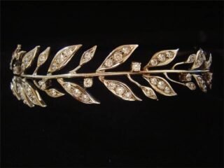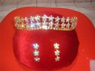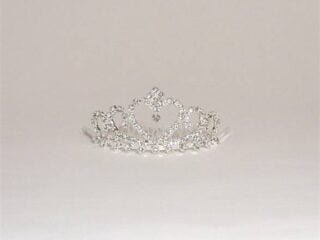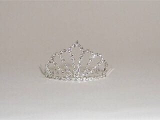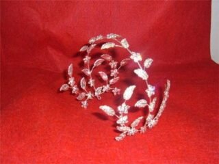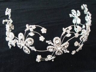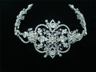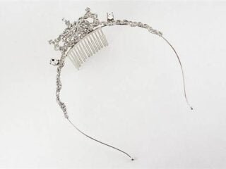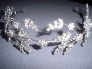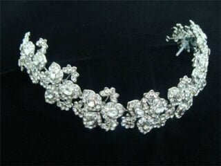 Pode ser usada uma coroa alta com véu, peças laterais ou pentes que pareçam jóias antigas. Vestido de época fica bem com uma tiara elaborada.
